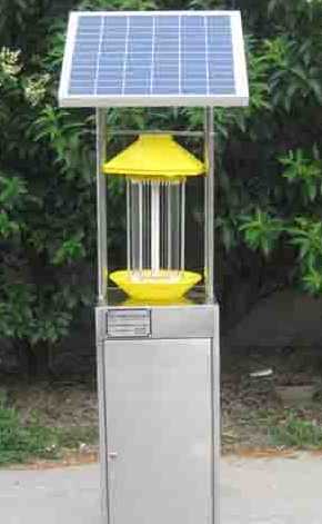利用太陽能電池板作為用電來源,其將白天太陽能發的電貯存起來,晚內上放電容給殺蟲燈具,供其工作。殺蟲燈具是利用365±50nm波長紫外光對昆蟲具有激備較強的趨光、趨波、趨色、趨性的特性原理,確定對昆蟲的誘導波長,研制專用光源,利用放電產生的低溫等離子體,紫外光輻射對害蟲間生的趨光興奮效應,引誘害蟲撲向燈的光源,光源外配置高壓擊殺網,殺死害蟲,使害蟲落下專用的接蟲袋內,達到滅殺害蟲的目的。